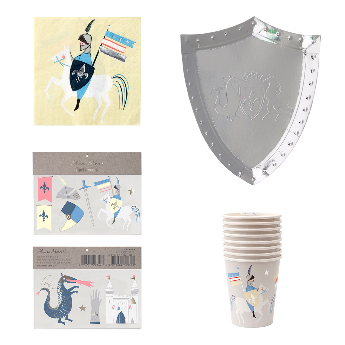 Το σετ περιλαμβάνει χάρτινα πιάτα στο σχήμα ασημένιας ασπίδας, χάρτινα ποτήρια και χαρτοπετσέτες με ιππότες και δράκους, αλλά και απίθανα τατουάζ για ατελείωτο παιχνίδι και τα πιο cool party favors!