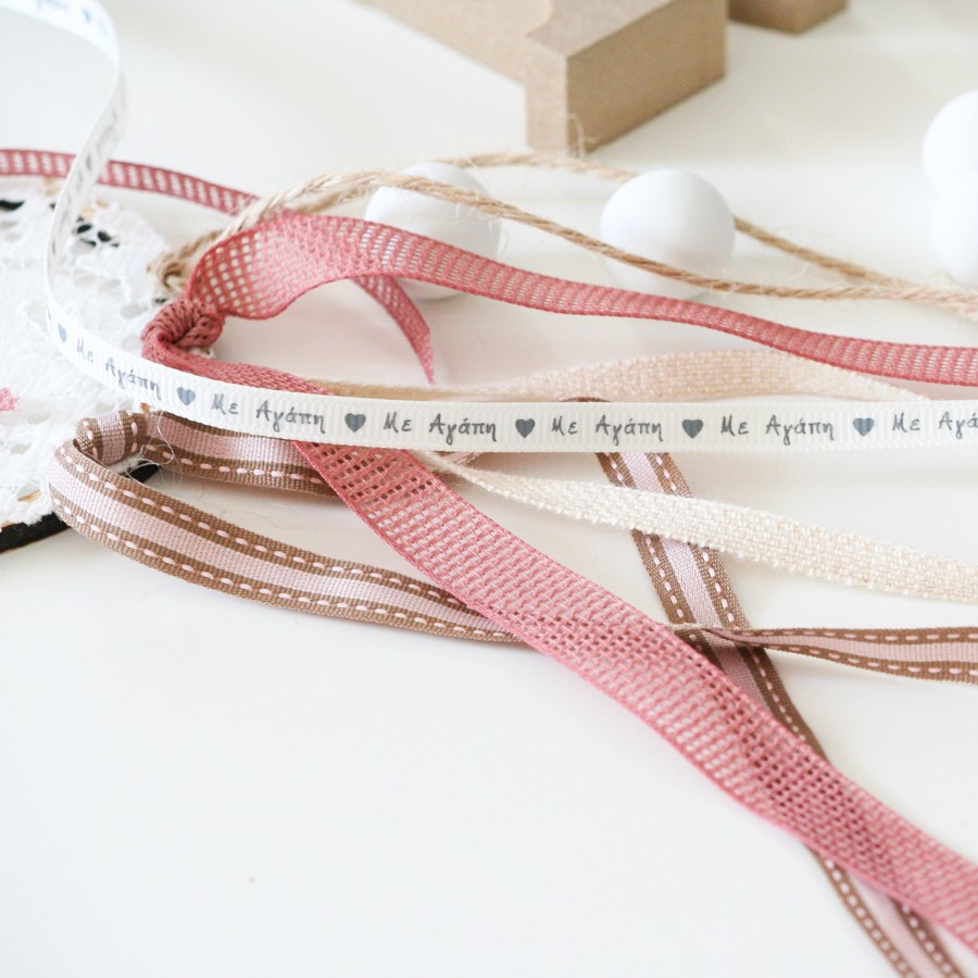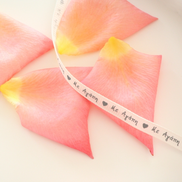 Η κορδέλα είναι λευκή, 25 γιάρδες, με τυπωμένο το "Με Αγάπη" και έχει πάχος 6mm.