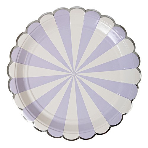 Κάθε πακέτο περιλαμβάνει 8 χάρτινα πιάτα φαγητού σε σχήμα μύλου και χρώμα λιλά-λευκό με ασημένιο φινίρισμα.